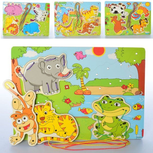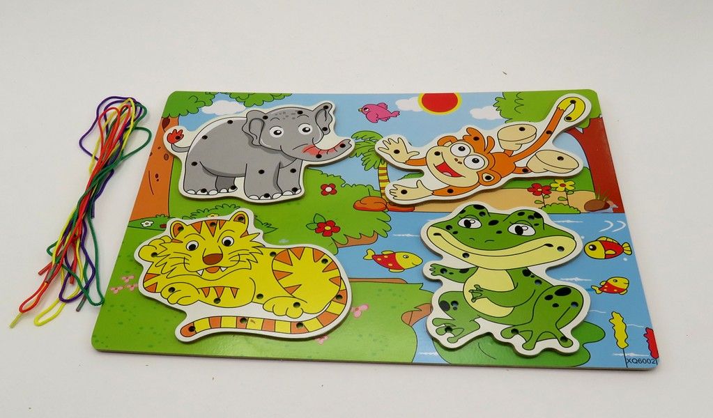 لعبة تمرير خيط تعليمية مصنوعة من الخشب، تحتوي على مجموعة من الأشكال الخشبية الممثلة لحيوانات الغابة مثل الأسد، الزرافة، الفيل وغيرها. كل قطعة بها فتحات مخصصة لتمرير الخيط، مما يجعلها مثالية لتطوير مهارات التنسيق بين اليد والعين، وتعزيز التركيز والدقة لدى الأطفال بطريقة ممتعة وآمنة.