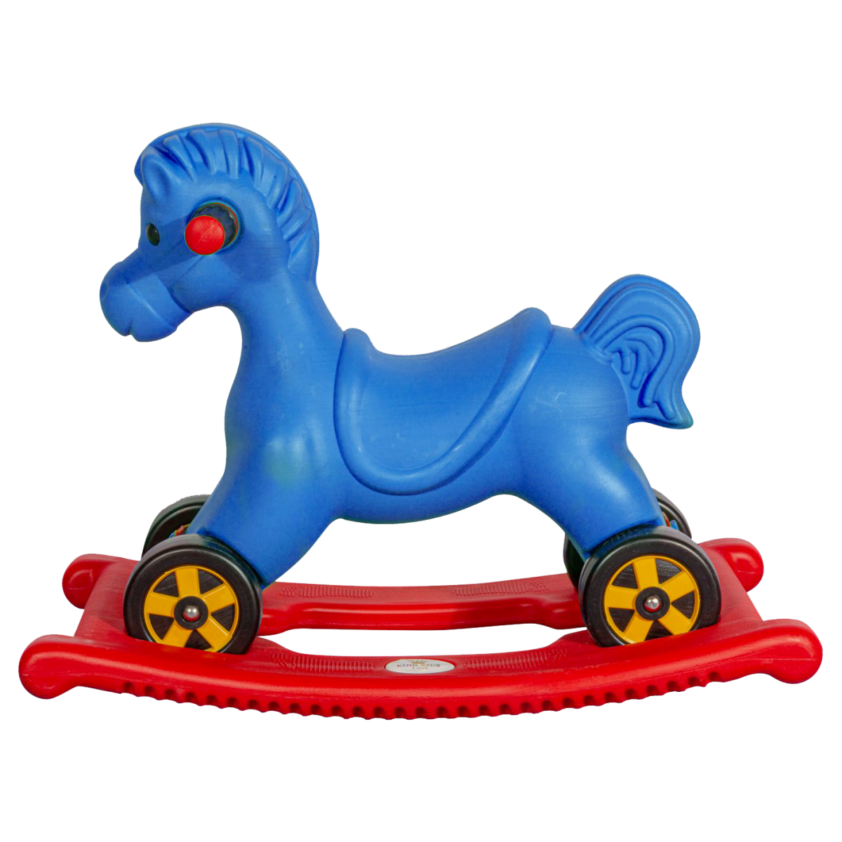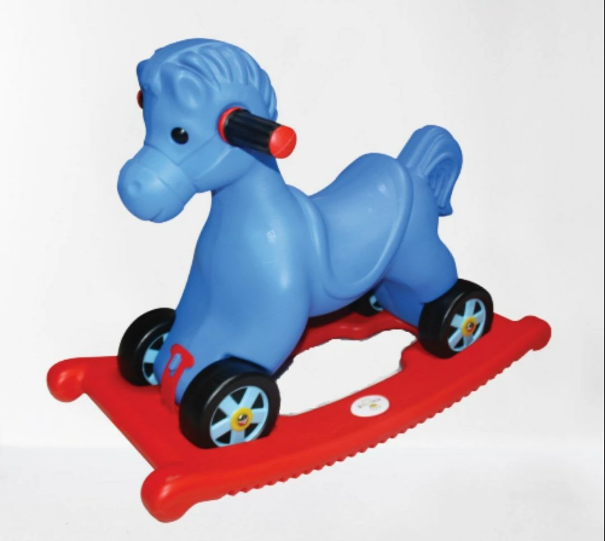 يتميز الحصان بشكل جذاب (لون أزرق)، ومقابض للإمساك، وقاعدة قوية تساعد على الثبات أثناء التأرجح. العجلات تتيح حرية الحركة، ما يساعد الطفل على تقوية عضلات الجسم وتنمية التوازن.