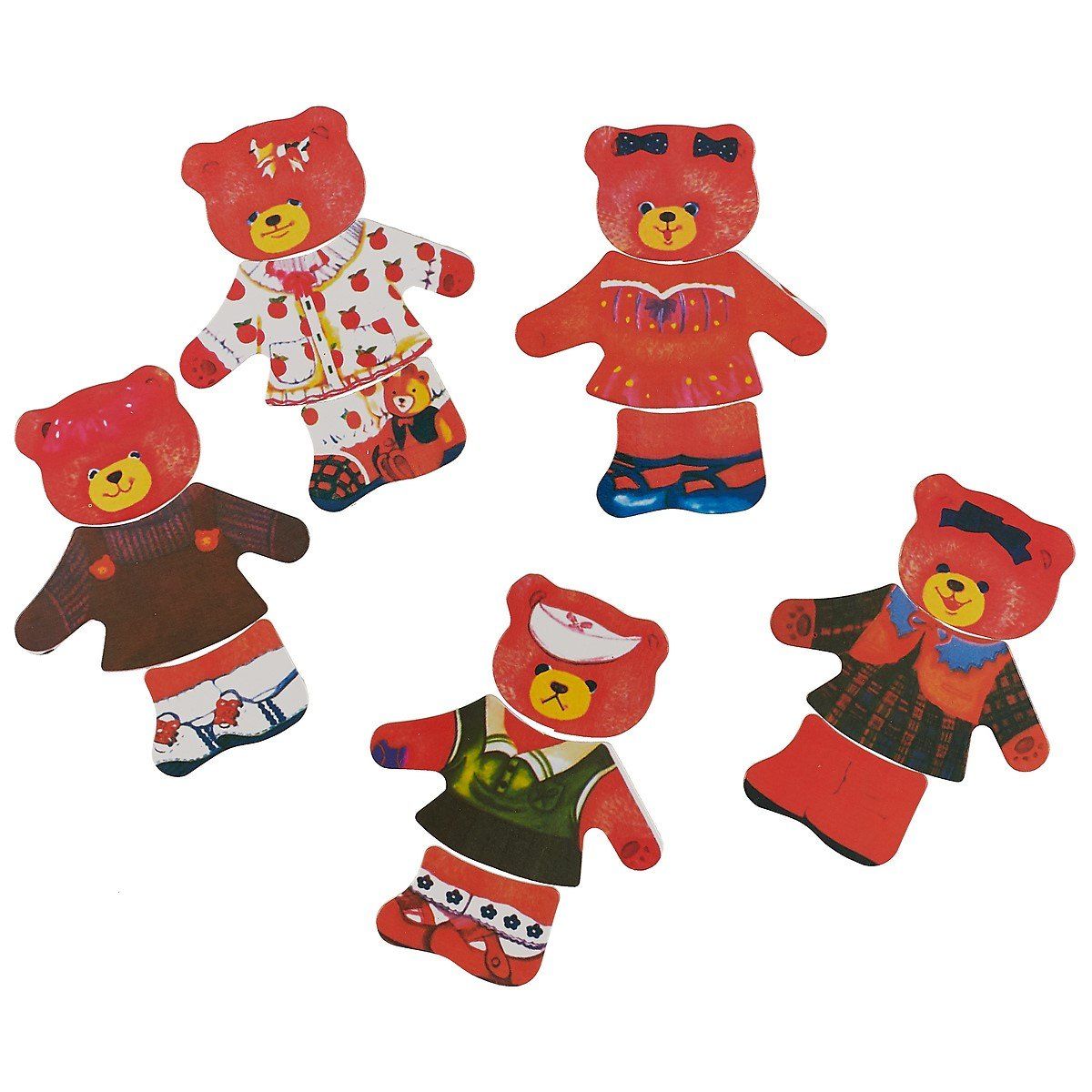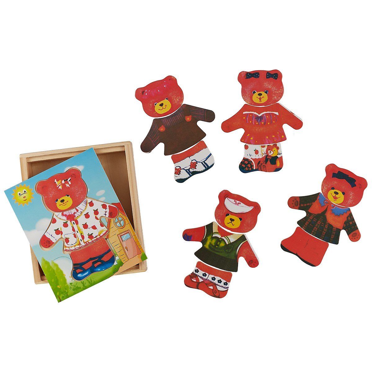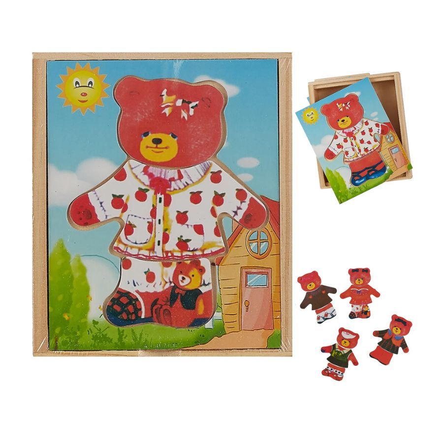 لعبة خشبية تحتوي على مجموعة من القطع لتشكيل دب واحد بأزياء متعددة. تتيح للأطفال تبديل الملابس وتغيير ملامح الوجه، مما يساعد على تنمية المهارات الحركية الدقيقة وتعزيز الخيال أثناء اللعب.