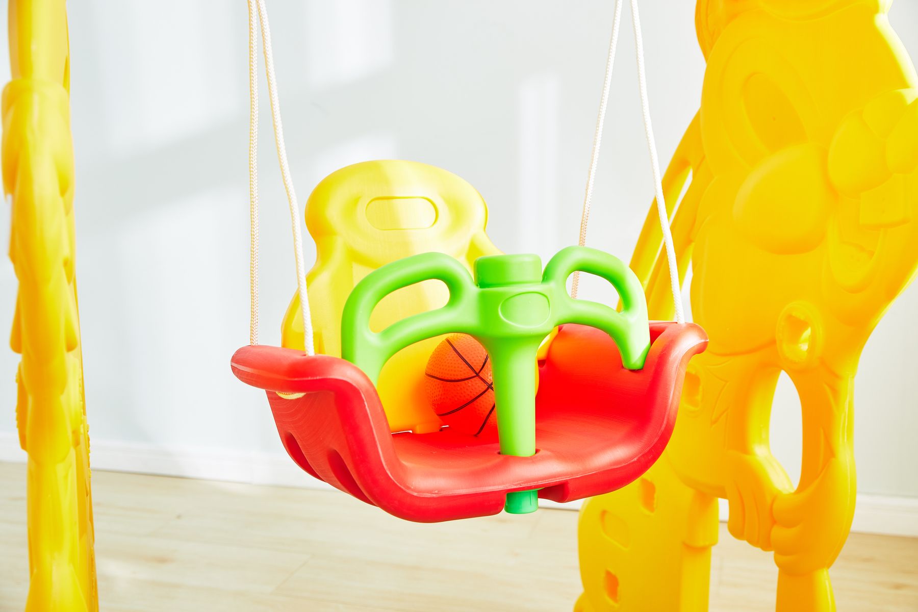 أمان فائق: حواف ناعمة، قاعدة مستقرة، ومرجيحة مزودة بمقعد حماية لحماية الطفل أثناء التأرجح.